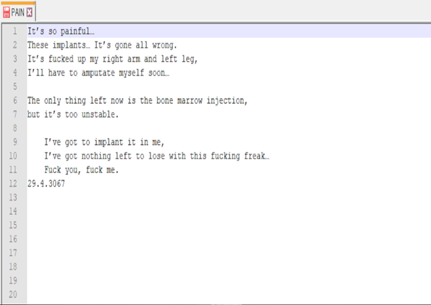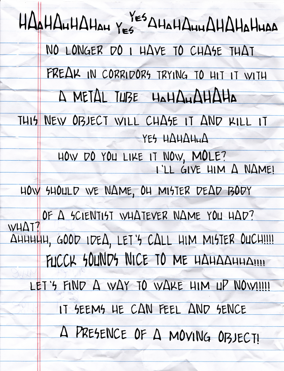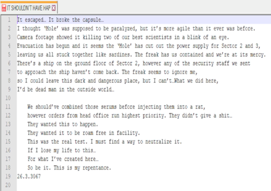 We wanted the player to experience the game’s narrative by designing the level to elicit environmental storytelling and finding interactable diary logs/‘notes’. I wrote these entries based on the discussions we had in preproduction in regards to the flow of the game and the narrative.