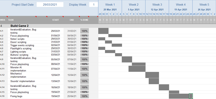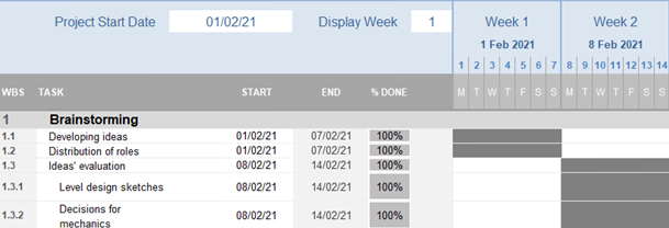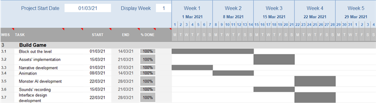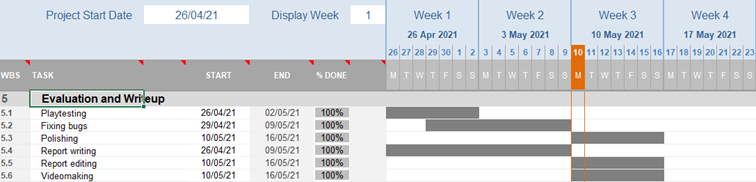 I created a Gantt Chart in Excel to manage the development and production processes in order to meet our targets and deadlines. This was integral to our teamwork and being able to communicate the natural flow of ideas at the most crucial of times, depending on where we were at in the project.