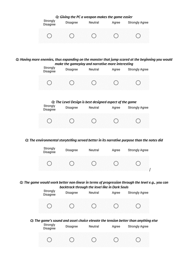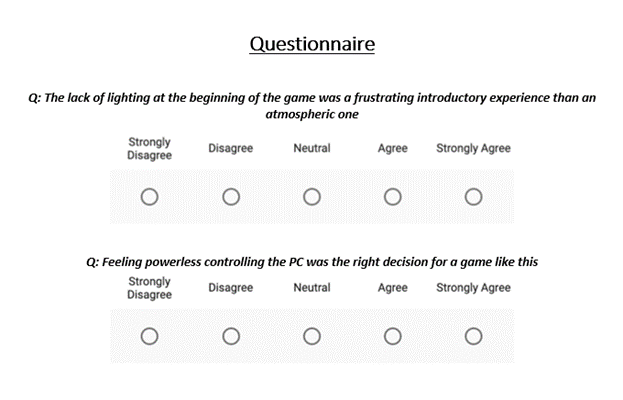 Lastly, we provided them with a questionnaire (Likert Scale) and an extra comments section to ascertain agreement and expand upon opinion towards metrics of specific design elements. This helped to collect more standardised data that isn't as suitable to ask about in the previous open ended interview. The prior interview's focus was more so a personal exploration into what they either appreciated or didn't appreciate about the game.