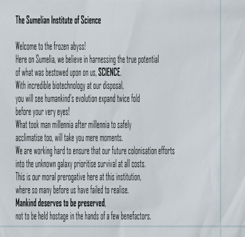 The player starts the game as they crash land their spaceship on a snowy planet and enter what appears to be a research facility. It appears to have been abandoned and feels rather eerie…