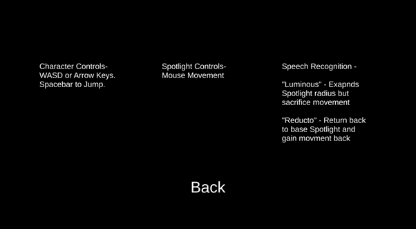 A prototype 2D Platformer utilising speech recognition in Unity. Use your voice to expand the spotlight’s radius to illuminate your surroundings and use your mouse to control the spotlight!